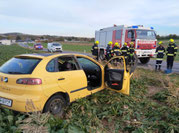 Ein Pkw kam nach einer Kurve von der Fahrbahn ab, überschlug sich und blieb im angrenzenden Feld auf den Rädern stehen. Zwei Personen wurden dabei verletzt, konnten das Fahrzeug jedoch selbstständig verlassen.