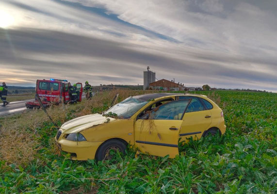 Nach einer Kurve war ein Pkw von der Fahrbahn abgekommen, hatte sich überschlagen und kam beschädigt im angrenzenden Feld auf den Rädern zum Stillstand. Zwei Personen wurden dabei verletzt, waren jedoch nicht eingeklemmt und konnten das Fahrzeug selbstständig verlassen.